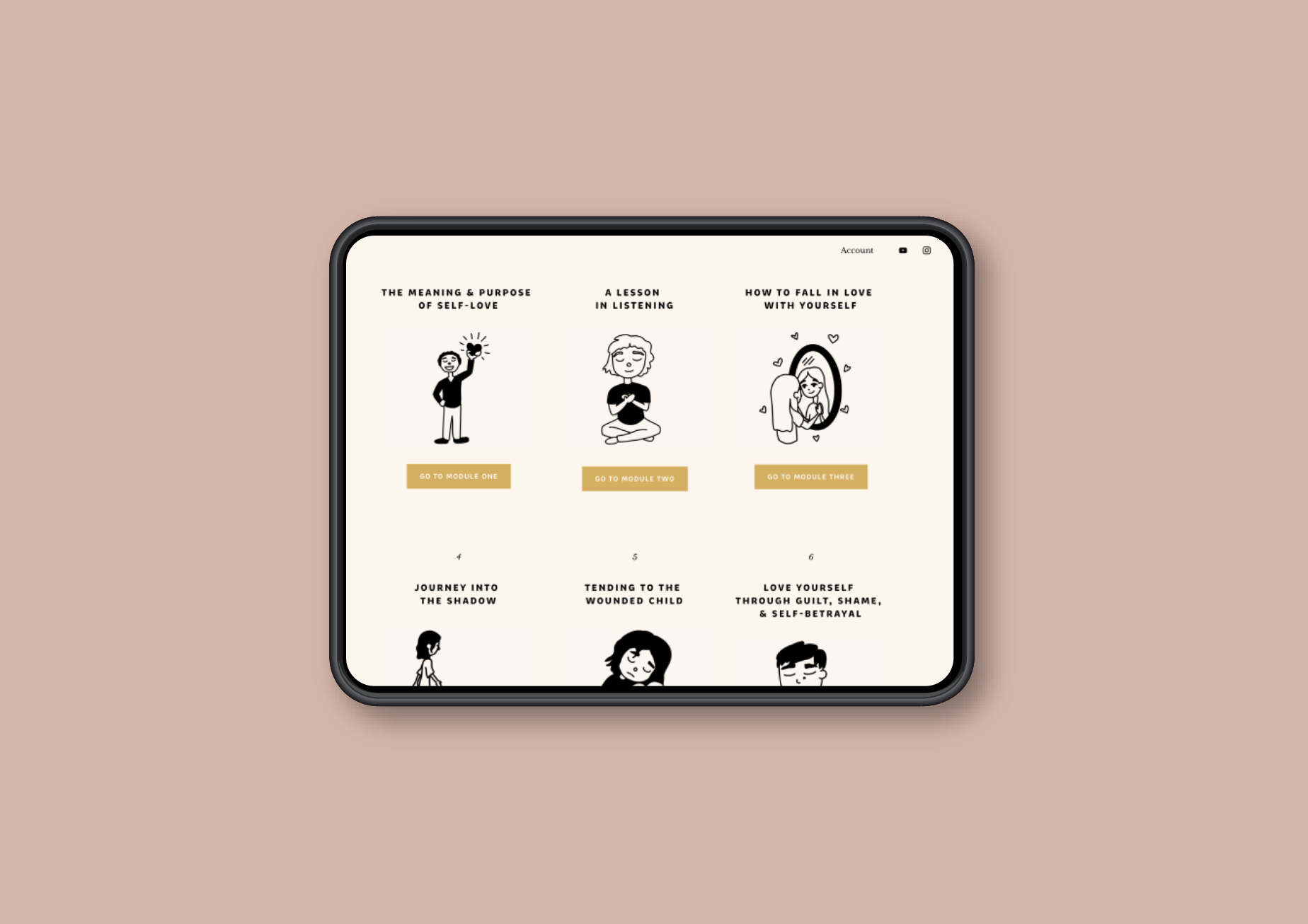 This is personal, of course, and will depend on how you decide to engage with the program. Each video per module is a different length of time detailed in the course curriculum. These are deep lessons reduced down to concise videos that are meant to be engaged with repeatedly. There are also workbooks that go with each module. It’s more important to go through the material slowly so you can integrate it rather than to blow through it quickly and try to skip steps. That’s not possible on the self-love journey.